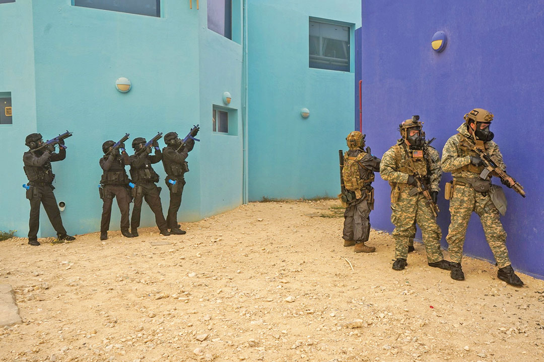 Two days of classes prepared participants for their exercise duties. Aside from engagements in the field, military personnel staffed the Combined Joint Operations Center on Qatar’s recently opened 401 Training Compound. The compound contains a mock village and the shell of an Airbus 300 passenger jet in which troops can train.
