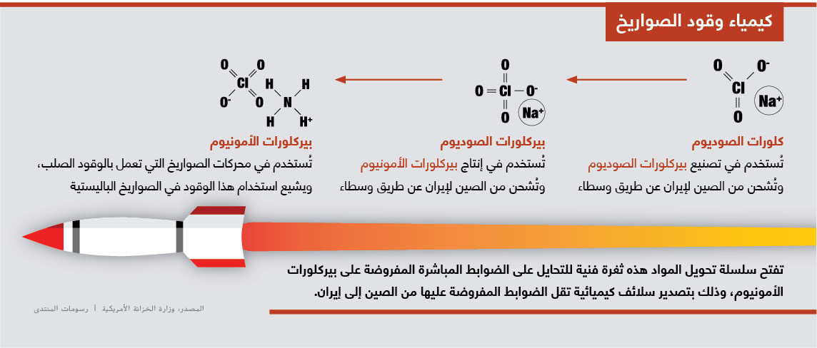 وقد‭ ‬كشفت‭ ‬الأمم‭ ‬المتحدة‭ ‬أن‭ ‬شركات‭ ‬صينية‭ ‬قد‭ ‬صدَّرت‭ ‬كميات‭ ‬كبيرة‭ ‬من‭ ‬هذه‭ ‬الكيمياويات،‭ ‬تجاوزت‭ ‬3,000‭ ‬طن‭ ‬سنوياً‭ ‬في‭ ‬عامي‭ ‬2024‭ ‬و2025،‭ ‬إلى‭ ‬شركات‭ ‬إيرانية‭ ‬مملوكة‭ ‬للدولة،‭ ‬ومنها‭ ‬الحرس‭ ‬الثوري‭ ‬وشركات‭ ‬مقاولات،‭ ‬وكثيراً‭ ‬ما‭ ‬فعلت‭ ‬ذلك‭ ‬عن‭ ‬طريق‭ ‬سلاسل‭ ‬إمداد‭ ‬وتموين‭ ‬معقدة‭ ‬غايتها‭ ‬التهرب‭ ‬من‭ ‬اكتشافها‭ ‬والإفلات‭ ‬من‭ ‬العقوبات‭. ‬ويحظر‭ ‬قرار‭ ‬مجلس‭ ‬الأمن‭ ‬الدولي‭ ‬رقم‭ ‬2231،‭ ‬الصادر‭ ‬في‭ ‬عام‭ ‬2015،‭ ‬بيع‭ ‬هذه‭ ‬الكيمياويات‭ ‬ذات‭ ‬الاستخدام‭ ‬المزدوج‭ ‬إلى‭ ‬إيران‭ ‬عبر‭ ‬قنوات‭ ‬الشراء‭. ‬وفرضت‭ ‬الولايات‭ ‬المتحدة‭ ‬طوال‭ ‬العام‭ ‬الماضي‭ ‬عقوبات‭ ‬على‭ ‬شبكات‭ ‬شراء‭ ‬متعددة‭ ‬يُزعم‭ ‬ارتباطها‭ ‬بوسطاء‭ ‬صينيين‭ ‬لقيامها‭ ‬بتوريد‭ ‬كميات‭ ‬كبيرة‭ ‬من‭ ‬سلائف‭ ‬بيركلورات‭ ‬الأمونيوم،‭ ‬ومسحوق‭ ‬الألومنيوم،‭ ‬والمواد‭ ‬المركبة،‭ ‬والأدوات‭ ‬الآلية‭ ‬الدقيقة،‭ ‬وكلها‭ ‬من‭ ‬لوازم‭ ‬تصنيع‭ ‬وقود‭ ‬صلب‭ ‬عالي‭ ‬الأداء‭. ‬ولهذه‭ ‬الكيمياويات‭ ‬استخدامات‭ ‬مدنية،‭ ‬ولكن‭ ‬تكمن‭ ‬المشكلة‭ ‬في‭ ‬التحقق‭ ‬من‭ ‬استخدامها‭ ‬النهائي‭ ‬ونمط‭ ‬تحويلها‭ ‬المتكرر‭ ‬إلى‭ ‬كيانات‭ ‬إيرانية‭ ‬خاضعة‭ ‬للعقوبات‭. ‬وشددت‭ ‬الولايات‭ ‬المتحدة‭ ‬في‭ ‬العام‭ ‬الماضي‭ ‬أيضاً‭ ‬العقوبات‭ ‬التي‭ ‬تستهدف‭ ‬تمويل‭ ‬الأنشطة‭ ‬النووية‭ ‬والصاروخية‭ ‬الباليستية‭ ‬الإيرانية‭ ‬التي‭ ‬لها‭ ‬علاقة‭ ‬بالصين‭ ‬من‭ ‬خلال‭ ‬تبادل‭ ‬النفط‭ ‬وصناعة‭ ‬السيارات‭.‬