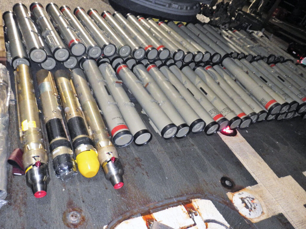The illicit arsenal — which included 150 anti-tank guided missiles — violated a United Nations Security Council embargo on supplying weapons to Houthi leaders and their representatives. Among the seized weapons were surface-to-air missiles, thermal imaging scopes for launching nighttime attacks, and components for unmanned aerial and surface vessels. The anti-tank missiles appeared to be Iranian-made versions of Russian Kornet missiles.
