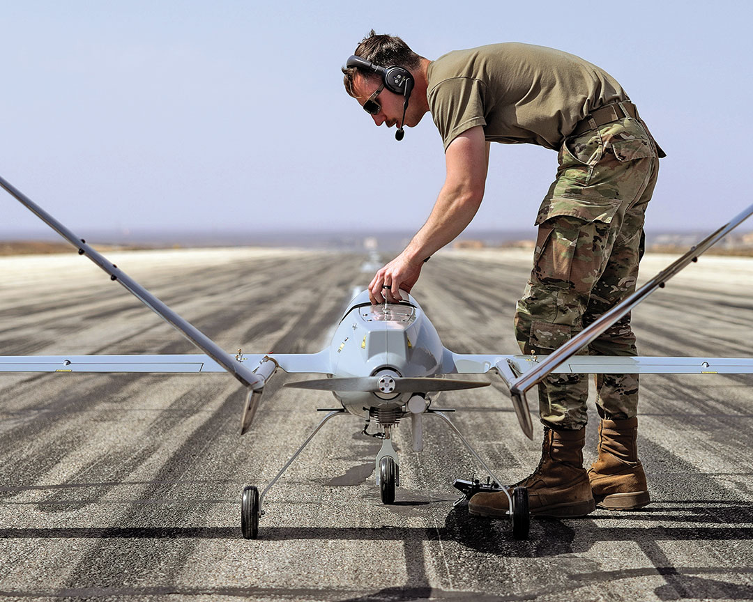 An Airman attached to Task Force 99, a U.S. Air Force unit whose mission is military innovation, inspects an unmanned aerial vehicle.  STAFF SGT. RICKY ARNOLD/U.S. AIR FORCE