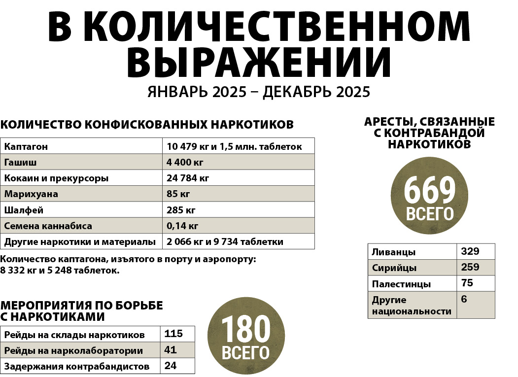 Данные, опубликованные Армейским командованием/Управлением ориентиров, показывают, что полевые операции в 2025 г. характеризовались заметной активизацией борьбы с сетями по производству, хранению и распространению наркотиков. Рейды были сосредоточены в долине Бекаа, северном и южном пригородах Бейрута и районе Метн, в результате чего были арестованы организованные группы и опасные лица, скрывающиеся от правосудия, изъяты склады оружия и боеприпасов, оборудование для производства наркотиков и большое количество каптагона, гашиша и химикатов. Попытки контрабандного провоза большого количества топлива, продовольствия и бензина через восточную и северную границы также были пресечены, и десятки людей были арестованы за незаконный въезд на ливанскую территорию.